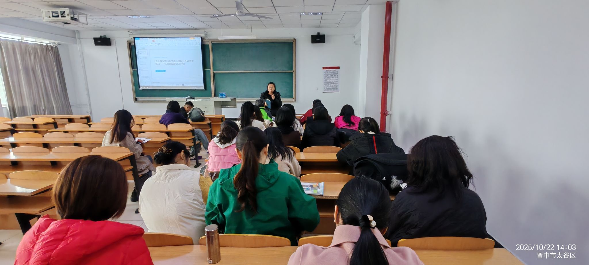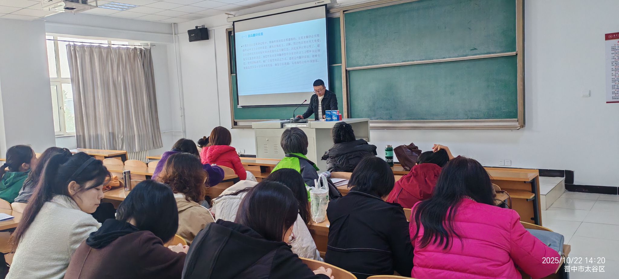 为提升教师语言服务素养,深化公共英语教学与地方文旅发展的融合,2025年10月22日,公共英语教研室在3-305会议室组织全体教师开展“景区外语标识译写规范”专题学习活动。本次活动由教研室主任冯洋洋老师主持,公共英语教研室孙祝斌老师担任主讲,分享其参加山西省翻译协会吴红星教授专题讲座的学习成果,公共英语教研室全体教师参与交流。