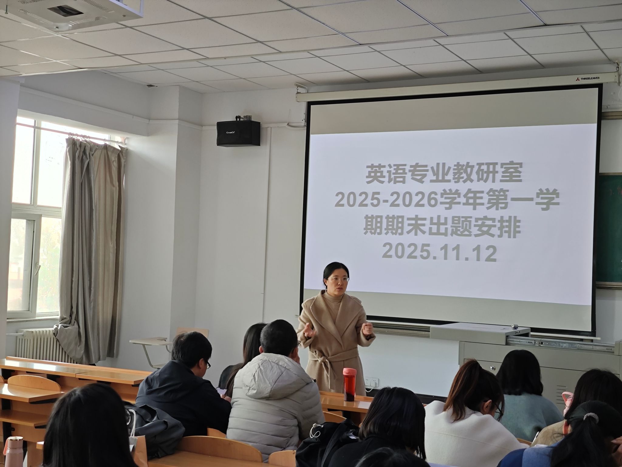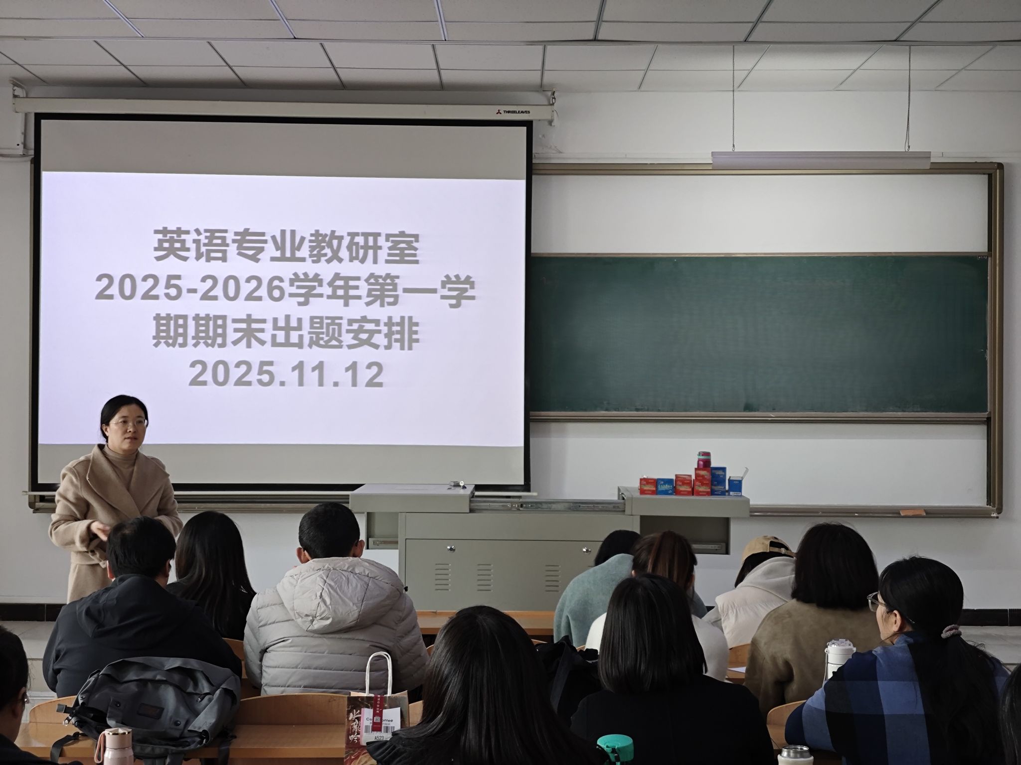 为进一步规范期末考试命题管理,确保试卷质量符合要求,英语专业教研室于2025年11月12日下午召开了2025-2026学年第一学期期末出题安排工作会议。会议由教研室主任张玉洁老师主持,教研室全体任课教师参加。