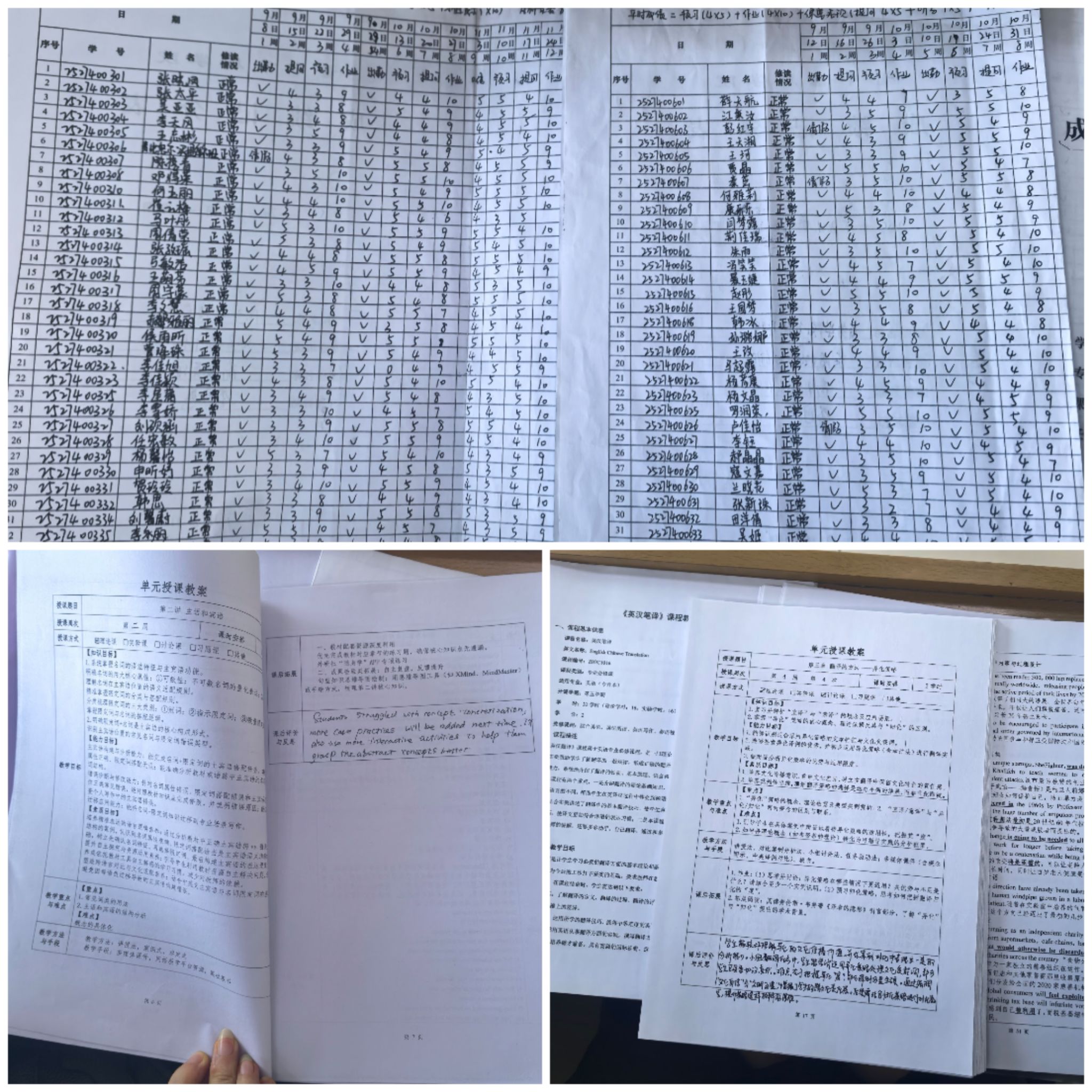 本次核查聚焦教案、教学反思、教学计划、学生成绩登记表、教学大纲等核心教学资料,以精细化检查清单为依据,对材料的完整性、规范性、实用性展开全面核验。核查过程中,教研室成员严格对标、逐项把关,重点审视教案设计与课堂实践的契合度、教学反思的深度与针对性、成绩登记的精准性以及教学大纲的执行落地情况。