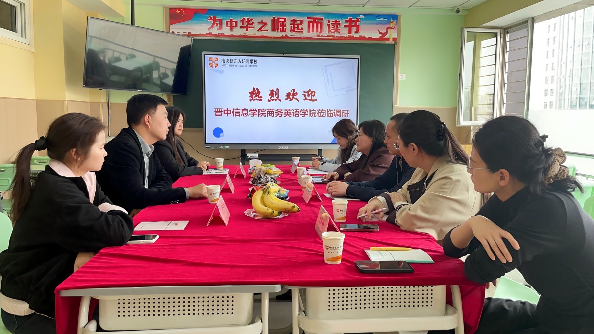 随后,双方落座展开交流。榆次新东方学校行政主管阴惠琴围绕学校的发展历程、办学规模、师资力量及课程体系等方面进行了系统讲解。作为成立于2001年的私立培训学校,榆次新东方学校具备“聘请外国专家资格”,办学资质完备,先后荣获“全国青年文明号”“全国教育培训百强学校”“山西省优秀辅导机构”“晋中市民办教育先进单位”等多项荣誉称号。学校下设全日制学前教育、英语培训部、培优中高考、大语文部、数学培训部五大核心教学板块,在榆次区域内拥有四所直营校区及一所高端英语培训中心,近5000平方米自主产权教学办公区,专职教师近百人,年培训学生超10000人次,已成为区域内规模领先、学科齐全的综合性培训学校。