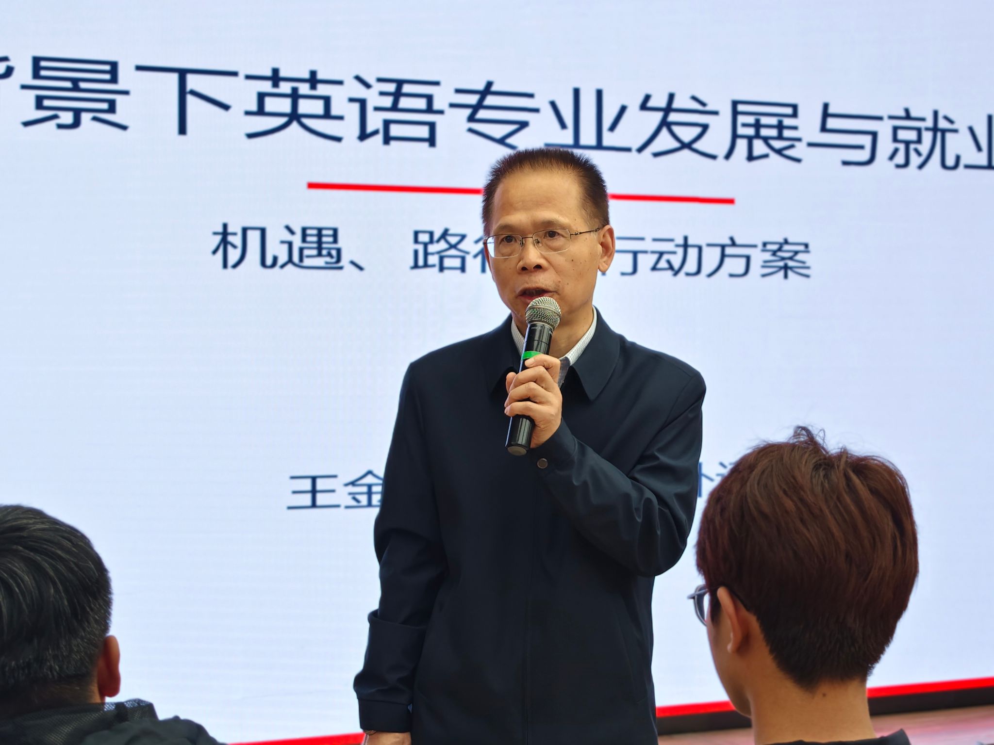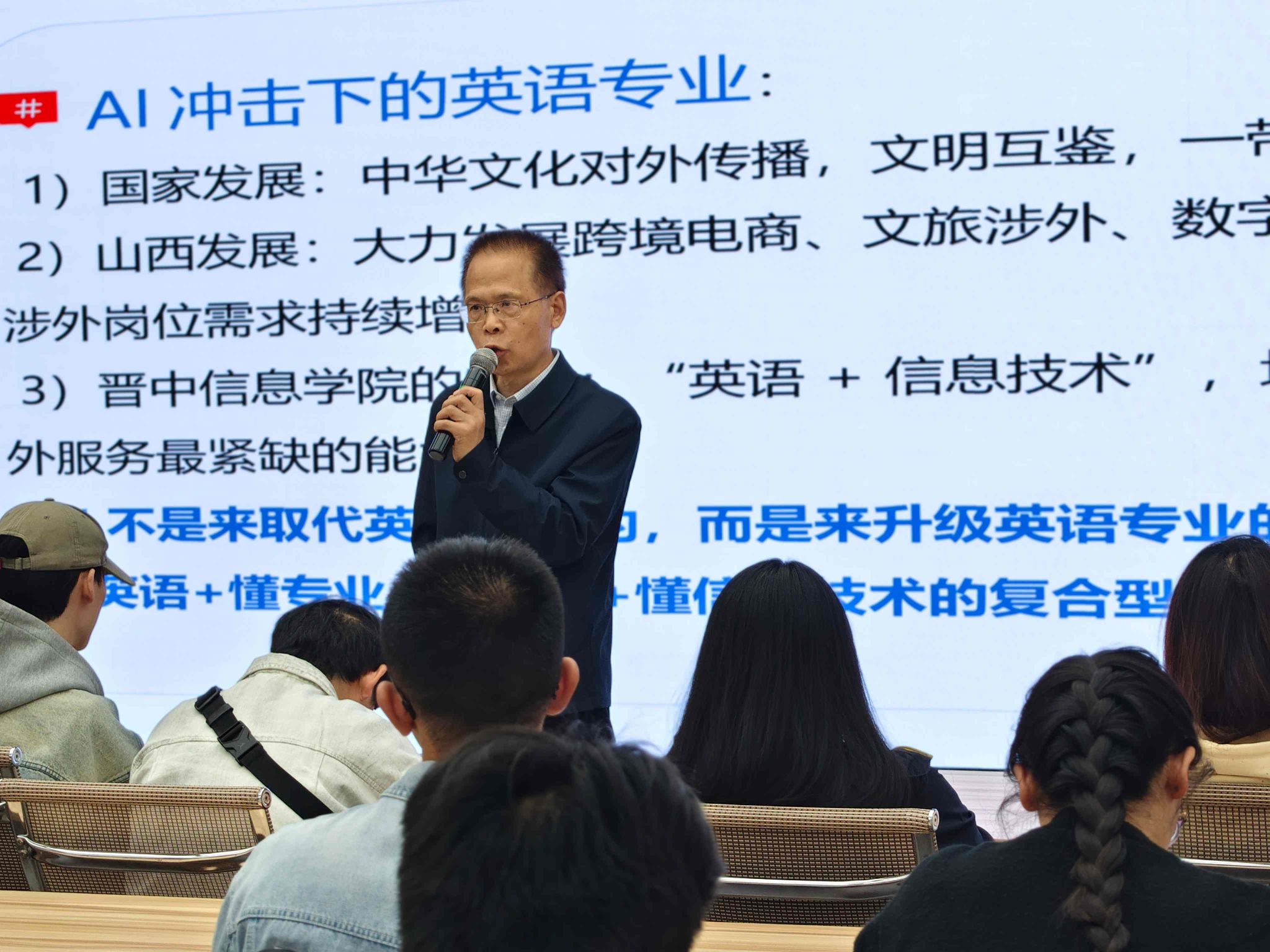 讲座中,王金巴教授针对当前英语专业面临的社会争议作出回应,他指出,随着人工智能发展与社会环境变化,社会上出现了“英语专业无用”“部分学校撤销英语相关专业”的声音,但这并不意味着英语专业失去了价值。相反,国家高水平对外开放的推进、山西地方涉外经济的蓬勃发展,以及跨境电商、文旅国际化等领域的快速崛起,均为外语人才提供了广阔的就业空间与发展机遇,英语专业在新时代依然大有可为。