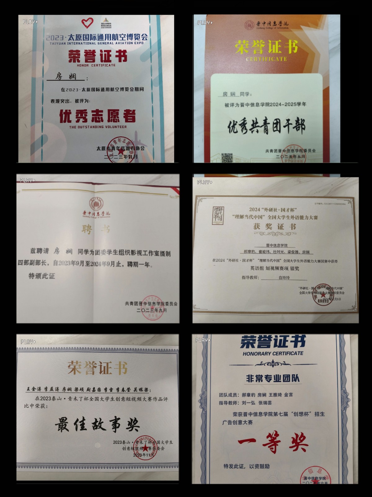 2023渝晋鲁·“博雅杯”通识素养大赛中,凭借扎实的综合素养斩获三等奖;第三届“信院杯”短视频大赛、2023泰山·青未了杯全国大学生创意短视频大赛中,分别荣获二等奖与“最佳故事奖”;2024年,在“外研社·国才杯”“理解当代中国”全国大学生外语能力大赛英语组短视频赛项中,我一举拿下省级金奖与国家级银奖;2025年,在第七届“创想杯”招生广告创意大赛中荣获一等奖;在“我们的故事,完满的故事——校媒人永远在路上”活动中获得二等奖;2024 - 2025学年晋中信息学院优秀共青团干部。