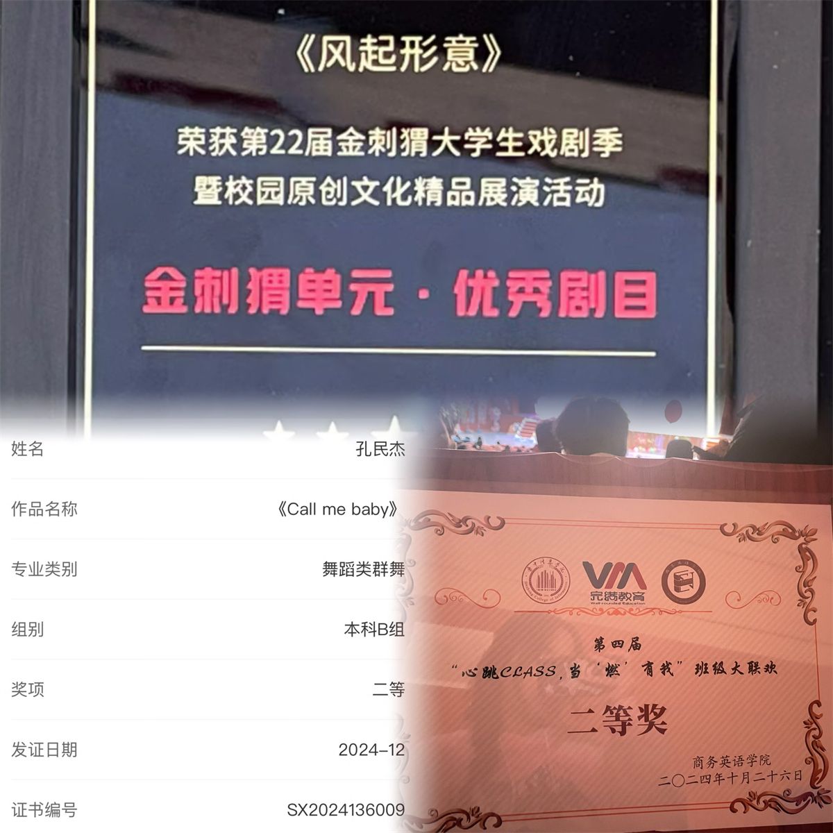 我常带着奔波的疲惫加入排练,伙伴们总会默默为我留出站位、耐心陪我复健动作,这份齐心让我咬牙坚持。比赛当天,我们身着统一舞服,用整齐划一的舞姿、饱满的情绪完成了表演。最终,我们不负众望,斩获大赛二等奖。这份荣誉,是属于整个舞团的勋章,更是齐舞路上,我们同心同频、共克难关的最好见证。