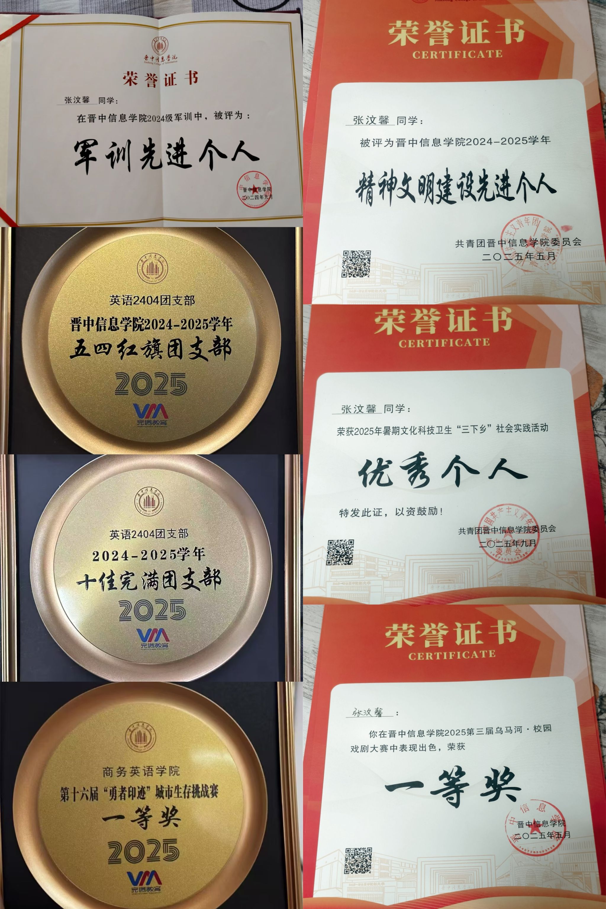 过去的一年,于我而言是在挑战中成长,在付出中收获的。我曾直面前行路上的诸多考验,也凭借点滴努力收获了属于自己的荣光。在2024级军训中获评“军训先进个人”;2025年暑期文化科技卫生“三下乡”社会实践活动中荣获优秀个人;2024-2025学年被评为晋中信息学院“精神文明建设先进个人”;带领英语2404团支部斩获晋中信息学院2024-2025学年“五四红旗团支部”“十佳完满团支部”;在2025第三届乌马河·校园戏剧大赛中荣获一等奖;代表商务英语学院在第十六届“勇者印迹”城市生存挑战赛中拿下一等奖。