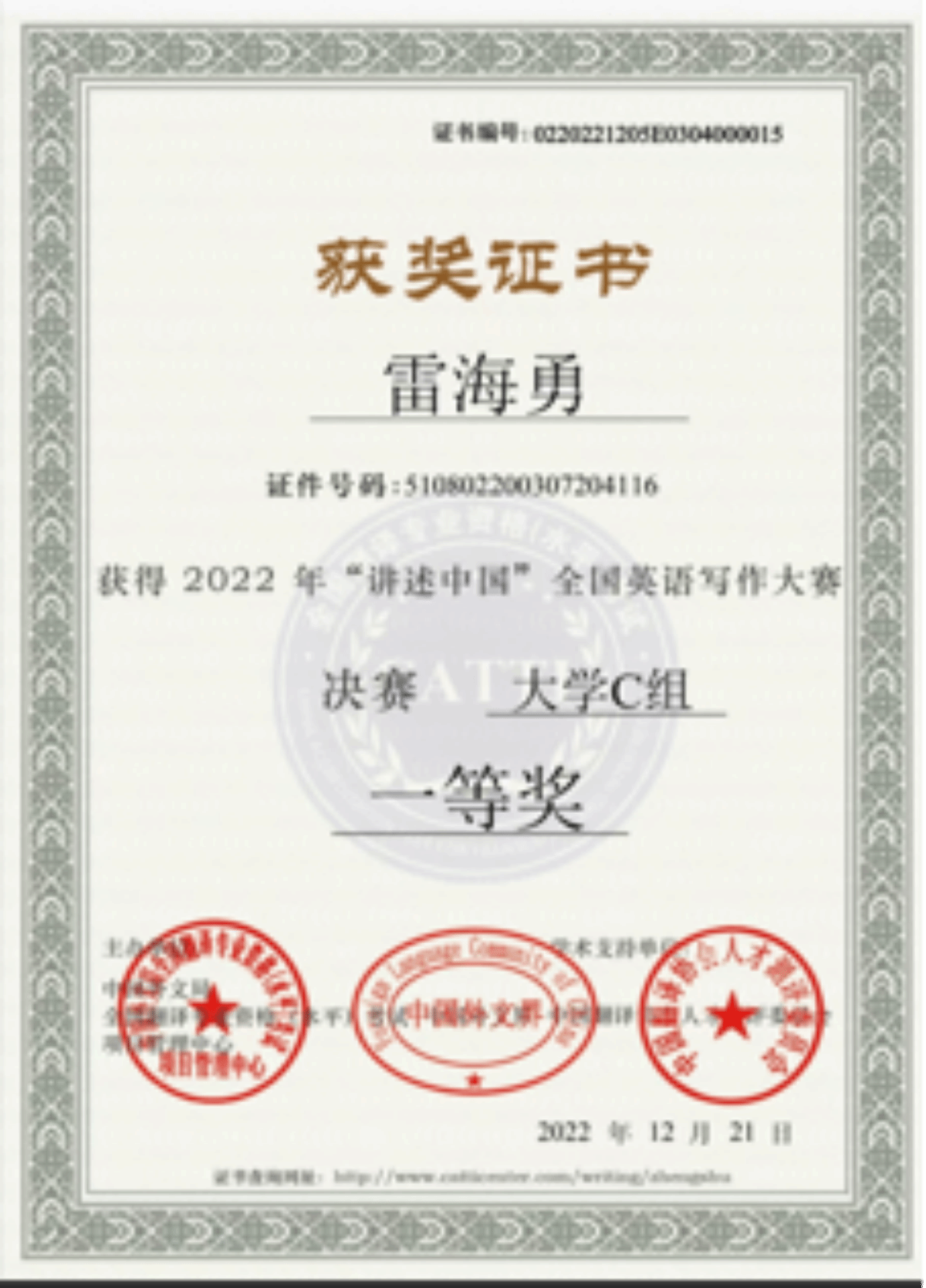 2022年,报名参加首届“讲述中国”写作大赛。起初,我一味纠结语言表达是否精准,却忽略了文字背后的文化立场。历经多轮打磨修改,在老师的悉心指导下,我才幡然醒悟:英语写作从来不止是语言能力的展现,更是跨文化表达能力的锤炼——既要清晰传递事实,更要生动讲好中国故事。这段经历,让我开始主动思索“如何让中国故事被世界更好理解”,也为我后续参与外宣实践、各类表达类赛事筑牢了根基。