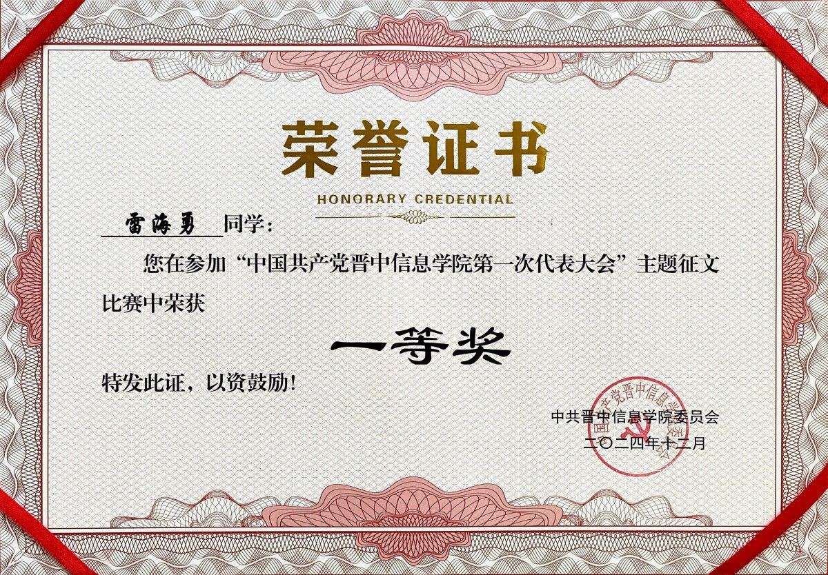 2024年,参加教育部首届大学生职业生涯规划大赛,获得校园初赛三等奖,并斩获山西省单项奖;