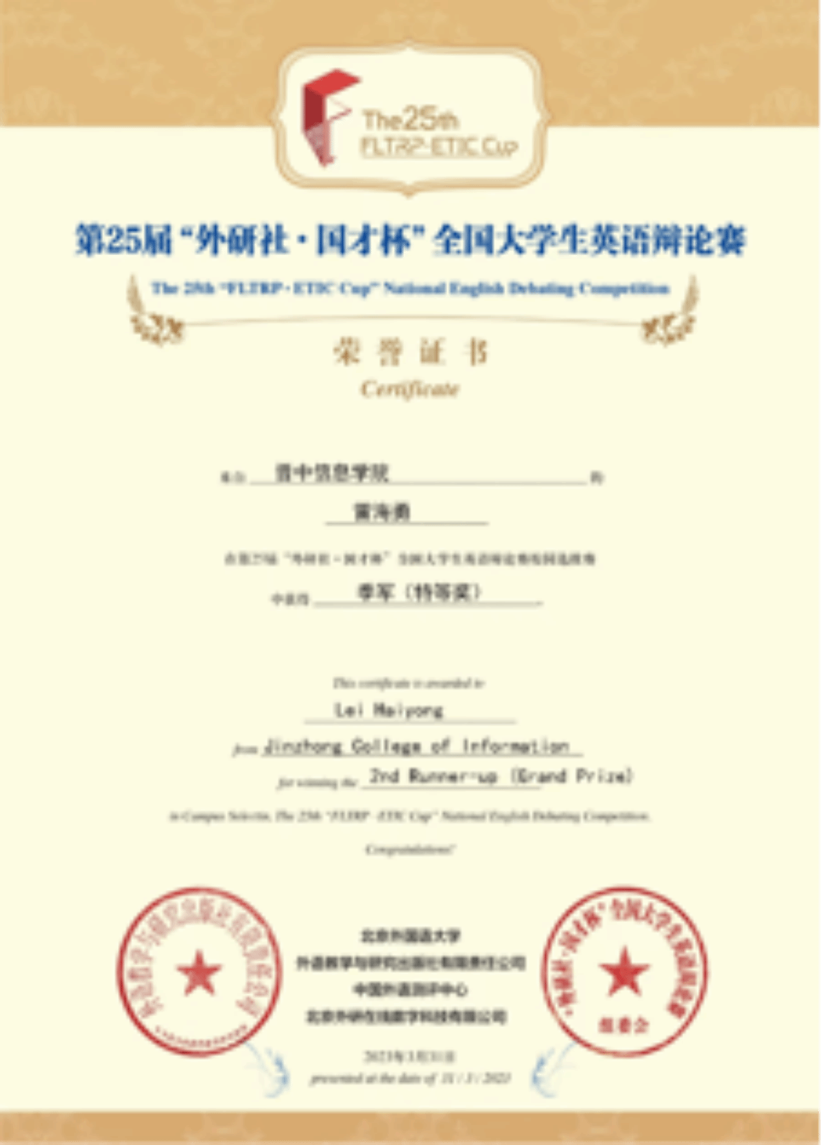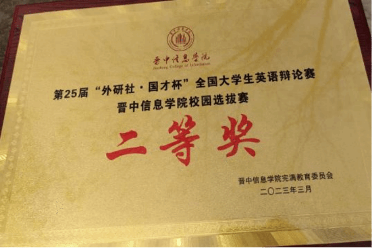 2023年,参与第二十三届外研社“国才杯”英语辩论赛校园选拔赛,团队获二等奖,我个人获“最佳辩手”;