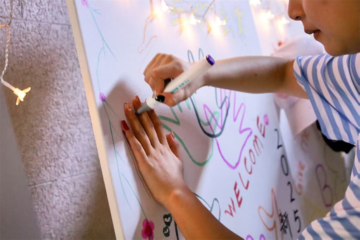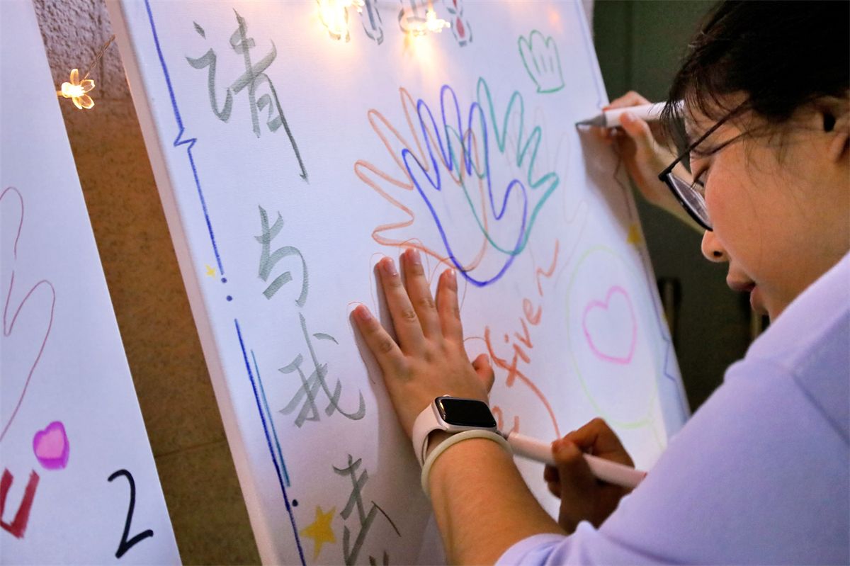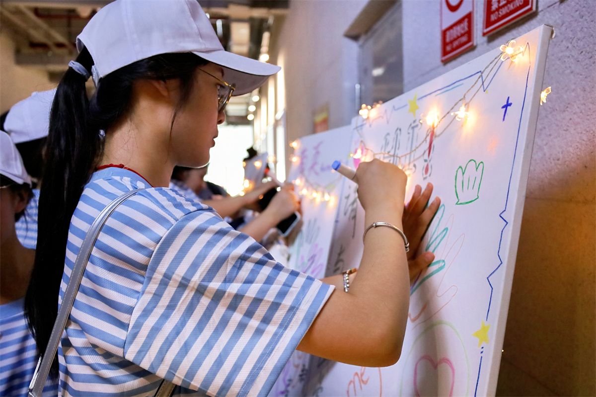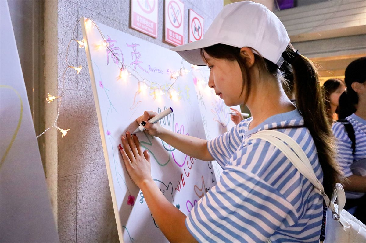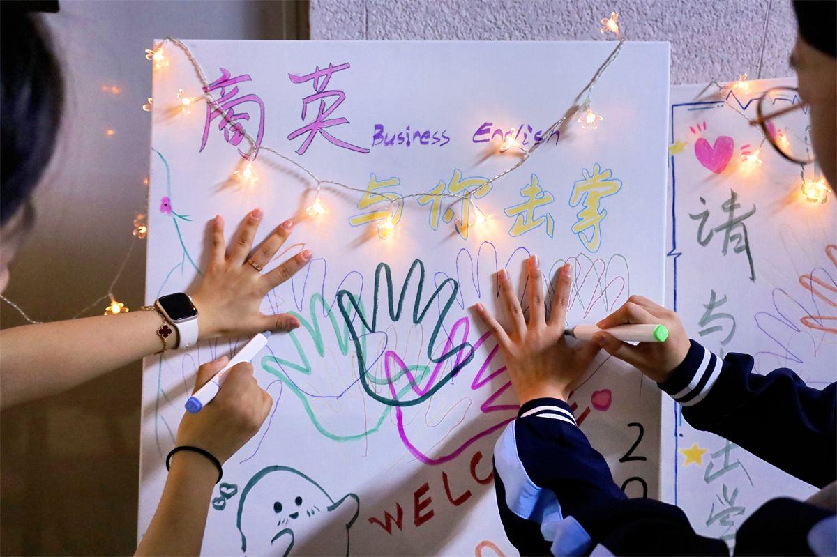 “请与我击掌”环节中,2025级新生在特制手掌纸上按下属于自己的青春印记,一枚枚掌印是个人与学院的“双向奔赴”,定格了他们正式融入商英大家庭的珍贵瞬间,一次次“击掌”,是梦想与行动的“契约签订”,承载着学院对新生学术攀登、人格塑造的双重期许。