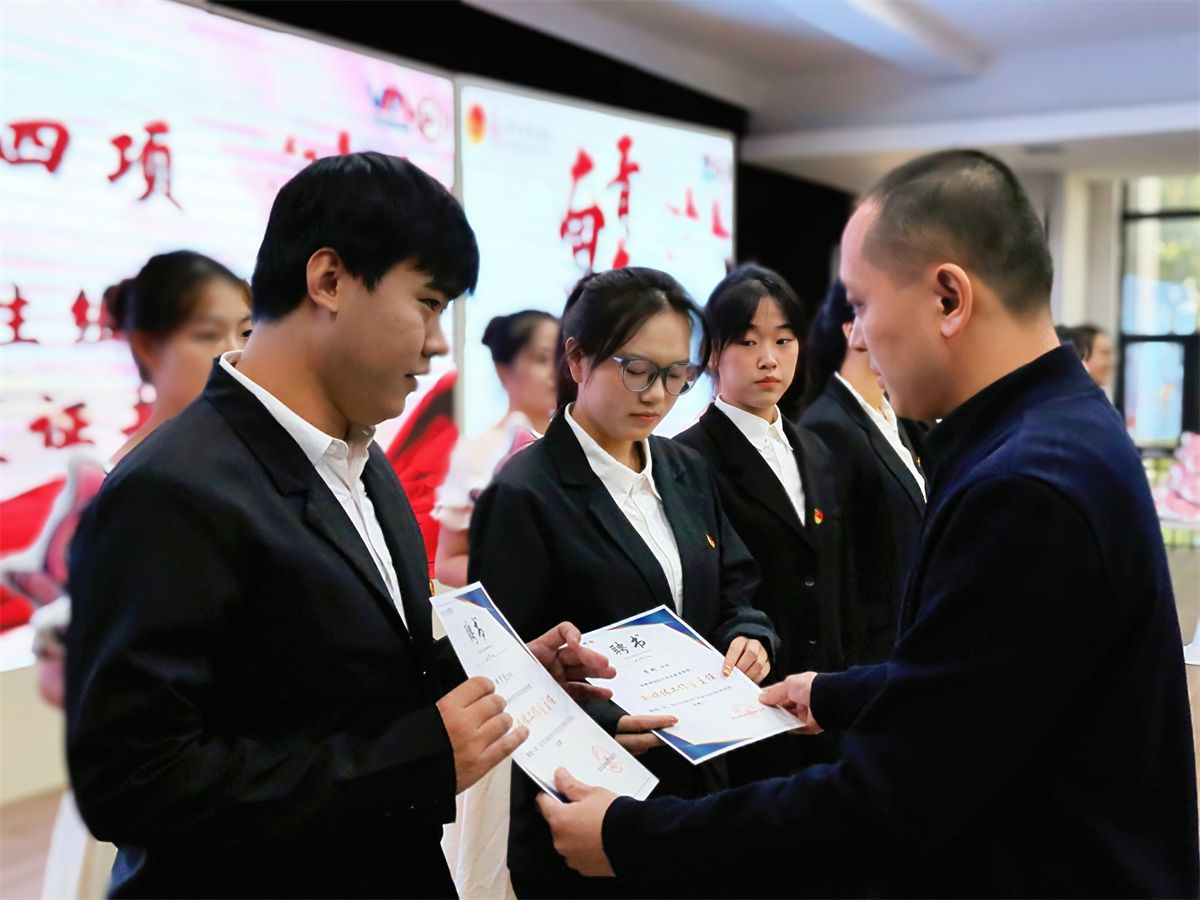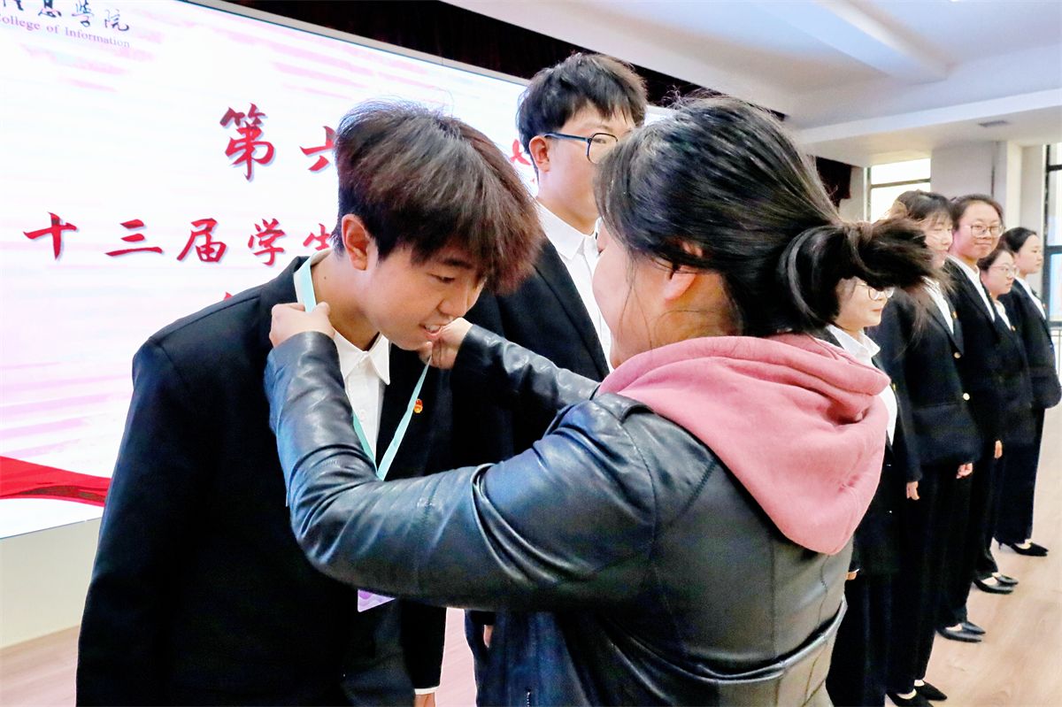 葛晓晶院长、郭凯英老师为第十三届学生组织成员代表佩戴工作证,崭新的证件佩戴在胸前,不仅是身份转变,更是使命落地。