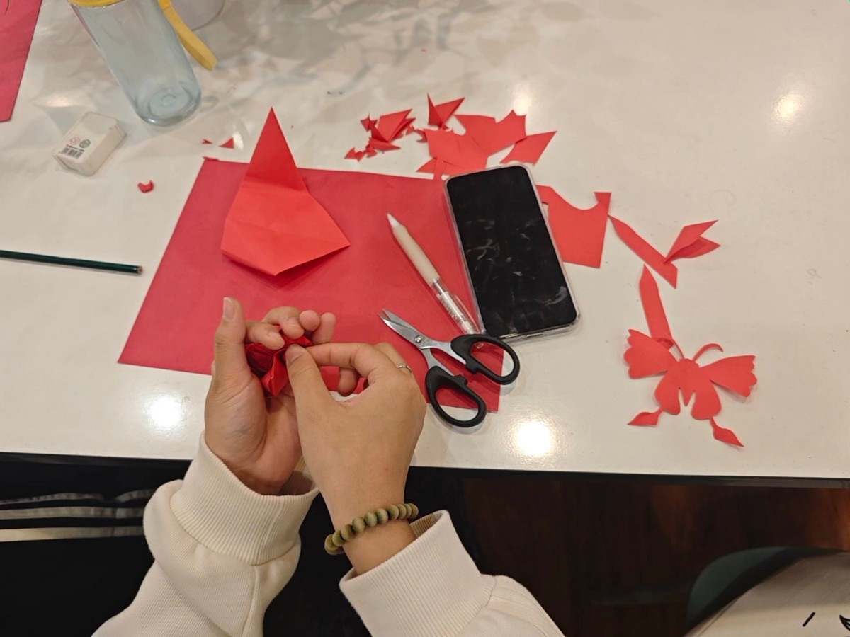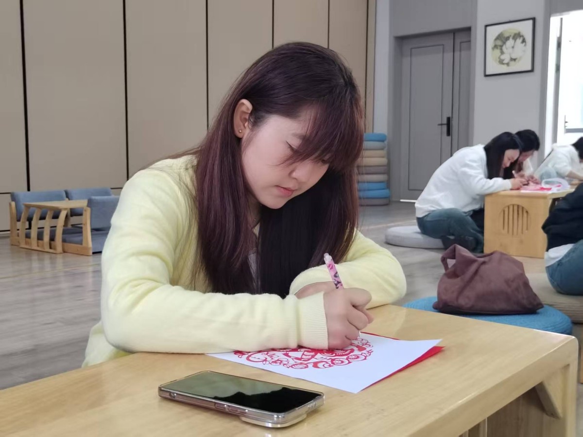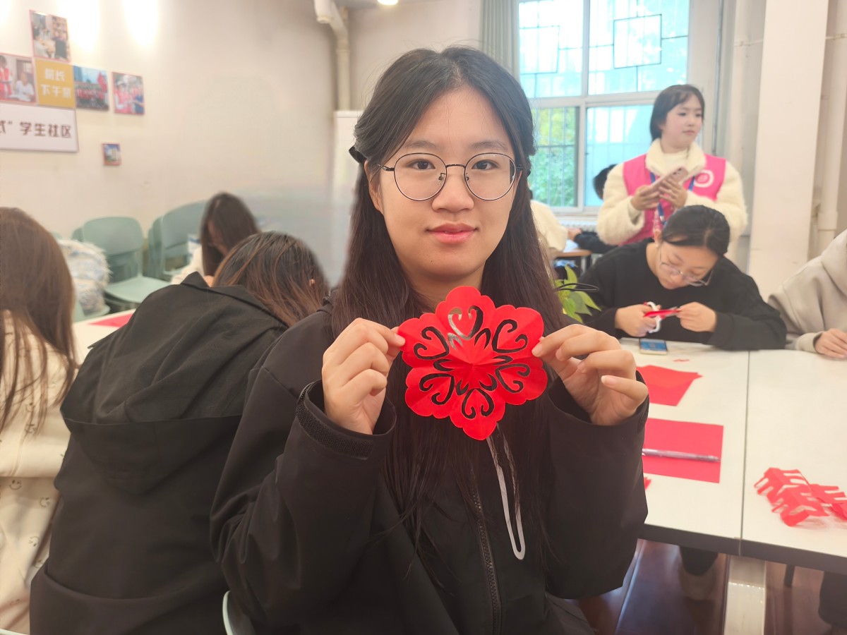 10月11日青藤书院116会议室红纸翻飞,英语2403班“巧手筑梦,纸韵中华”主题活动成功举办。活动以剪纸为媒,融国庆灵感,让家国情怀在方寸红纸间流淌。主持人讲解流程后,同学们或独运匠心、剪刻勾勒,或小组“接龙”、协作创作,普通红纸渐成一幅幅饱含爱国情的作品。展示环节,大家围聚观赏,分享创作巧思,抽象的家国情怀借剪纸具象传递。此次活动以“技艺传承+情感表达+互动创新”赋能非遗,让千年纸韵伴青春成长,让非遗在青年手中续写与时代同频的新章。