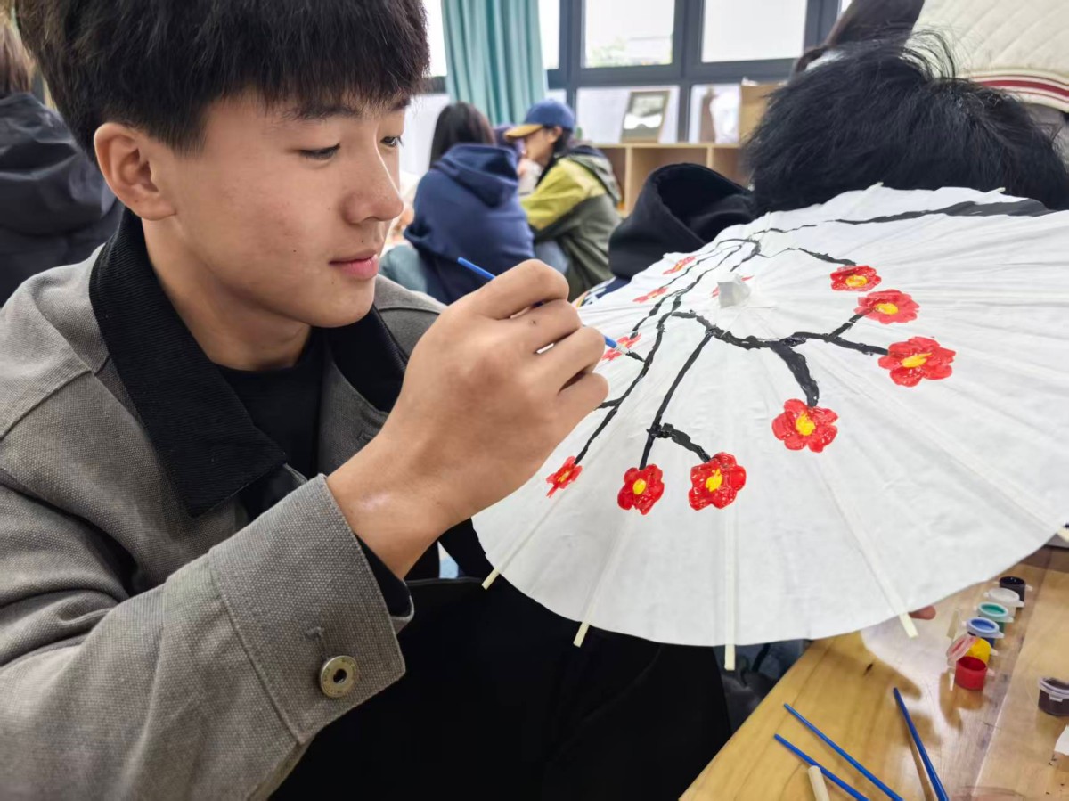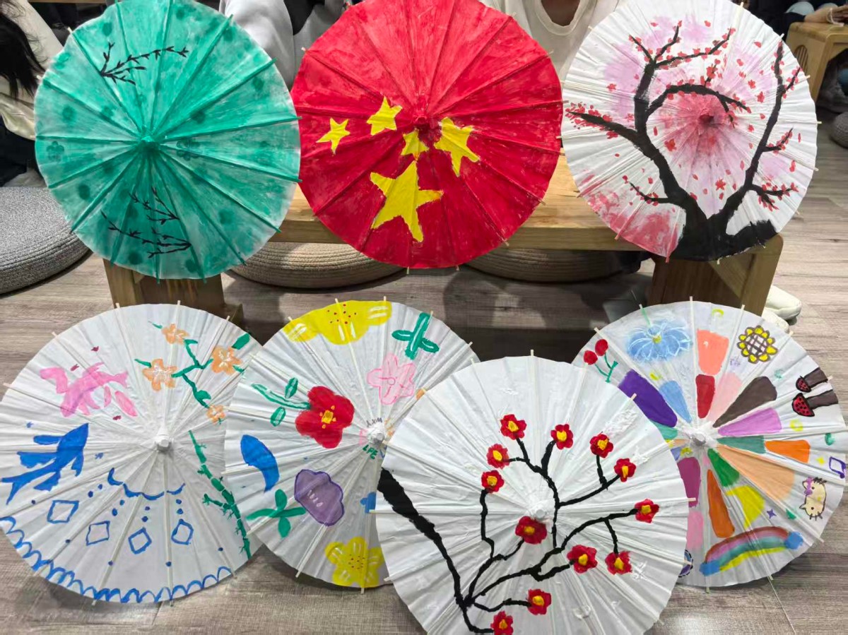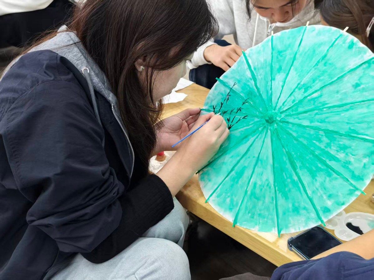 青竹为骨、皮纸为面、桐油为魂。10月12日,英语2503班一场油纸伞绘画活动吸引同学们参与,上河书院206竹林·围炉夜话内,大家亲手绘制图案、描绘色彩,触摸千年非遗温度,见证传统技艺当代焕新。油纸伞曾是古人必需品,藏“遮风挡雨”智慧与“团结向上”隐喻,却因现代伞具一度濒危。如今借非遗传承东风,成为青年传文化、表家国的载体。松竹梅、五星红旗、熊猫等图案,承载同学们对技艺与祖国的理解,也成沟通情谊的桥梁。