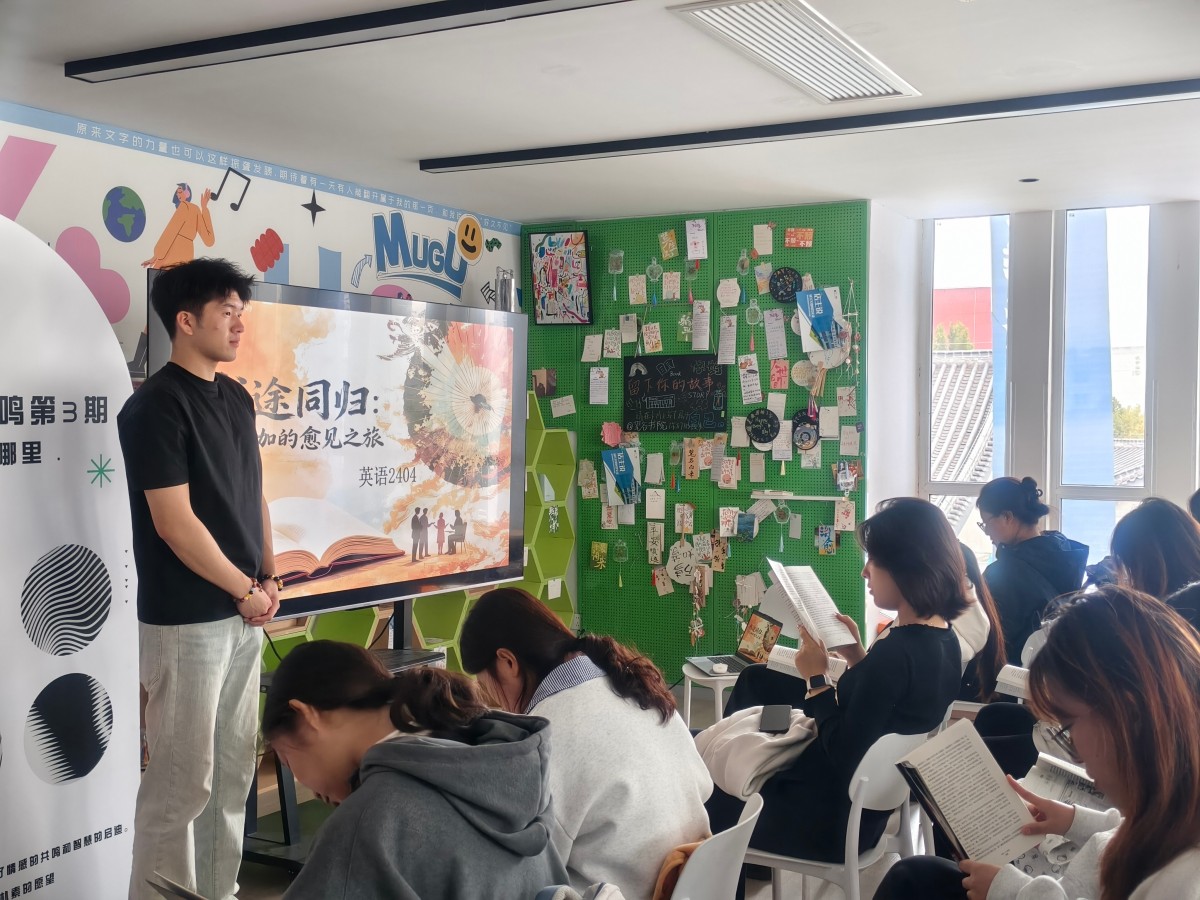 英语2404班于10月16日在毣谷书院小羽毛·故事巢举办“书途同归:与大咖的愈见之旅”活动,以趣味游戏促经典阅读与英语能力提升。活动先开启20分钟沉浸式阅读,同学们手捧中外经典,静心批注,与“文学大咖”对话。随后进入游戏环节:“画画猜词”中,组员画角色、众人竞猜,欢呼不断;“你划我猜英文版”升级难度,靠肢体传意、英语应答,协作氛围升温。活动打破传统阅读模式,激发文学热情,提升英语实践与团队意识,为校园书香文化注入持久活力。