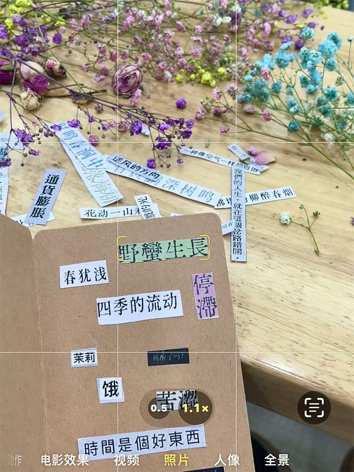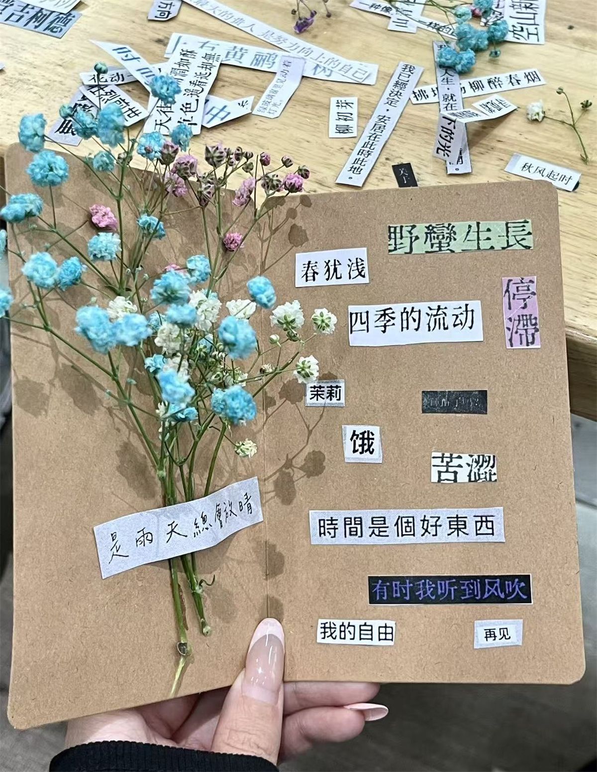 指尖起落间,零散的文字被赋予灵魂,一首首满含温情的拼贴诗,在桌案上悄然绽放。