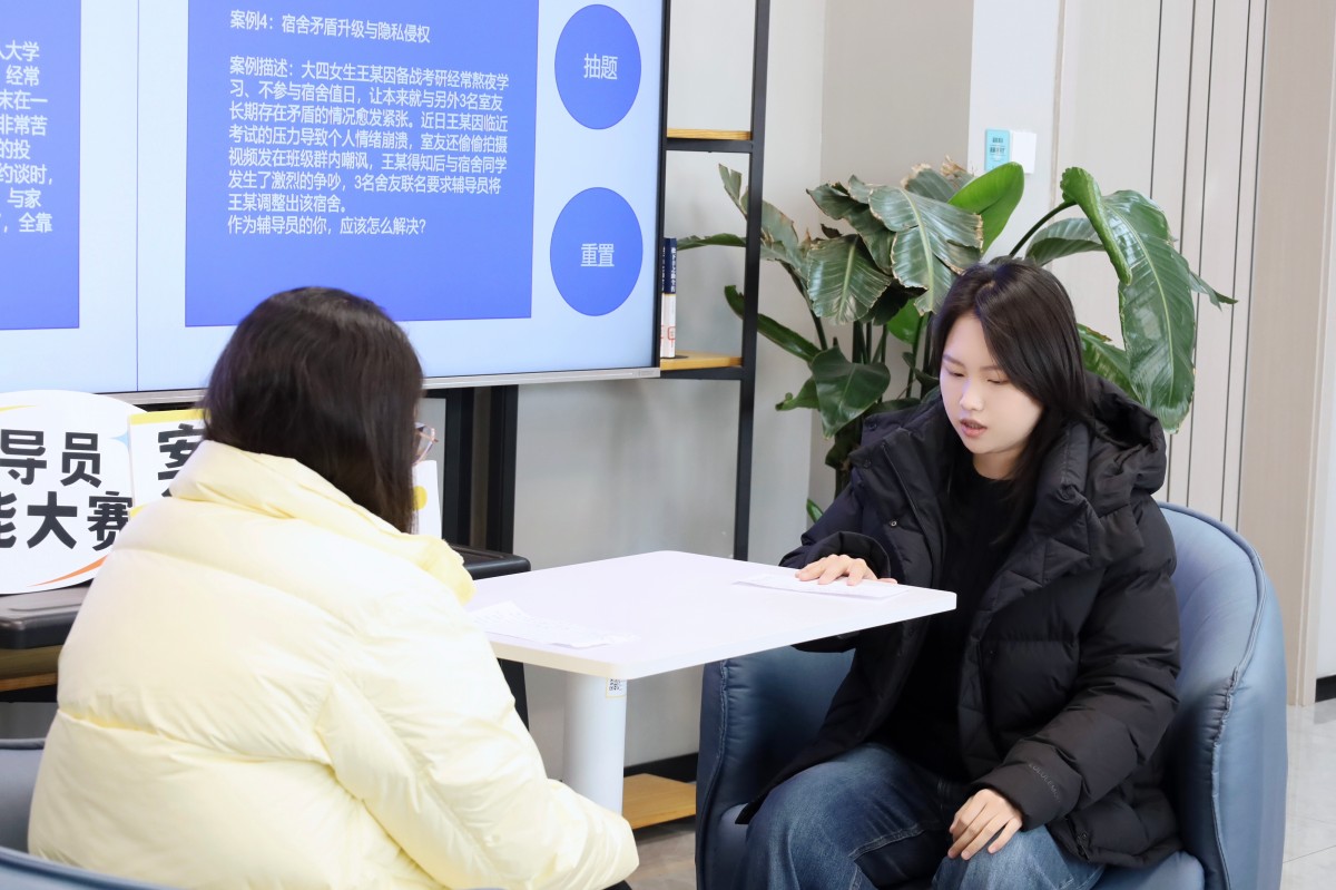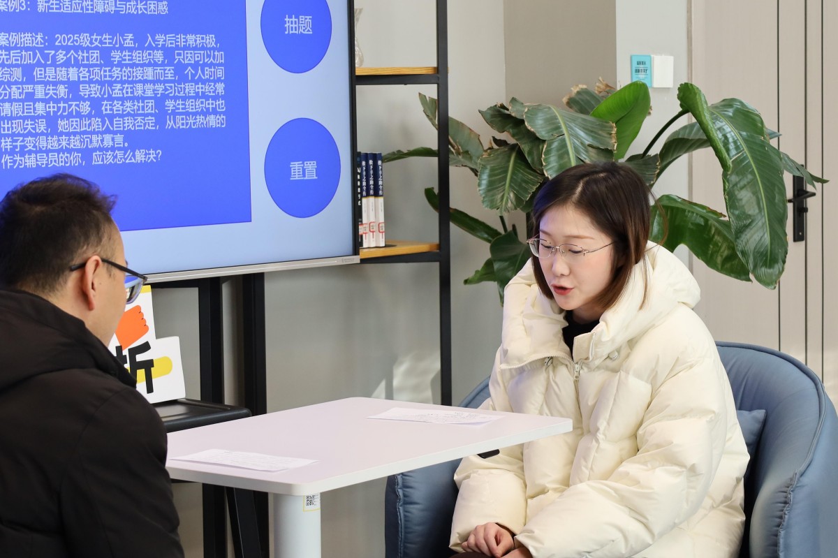 进入谈心谈话环节,辅导员队伍聚焦学生成长不同阶段的需求,针对学业压力较大学生、心理情绪波动学生、就业迷茫学生等不同类型对象,开展了多场景、沉浸式的模拟谈话。