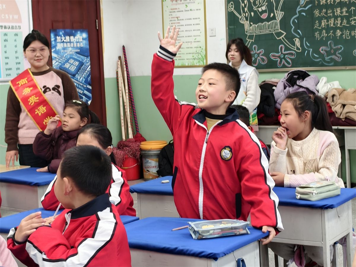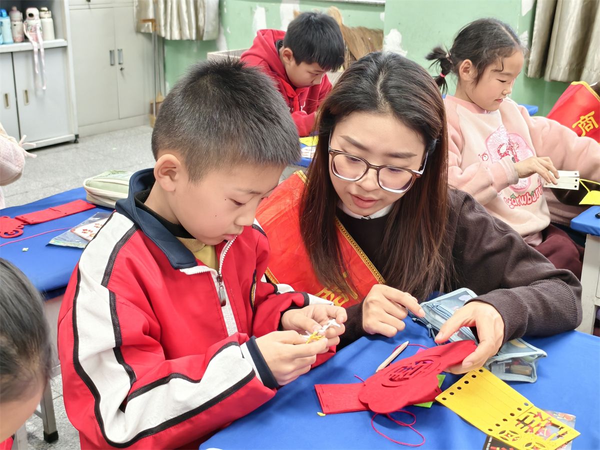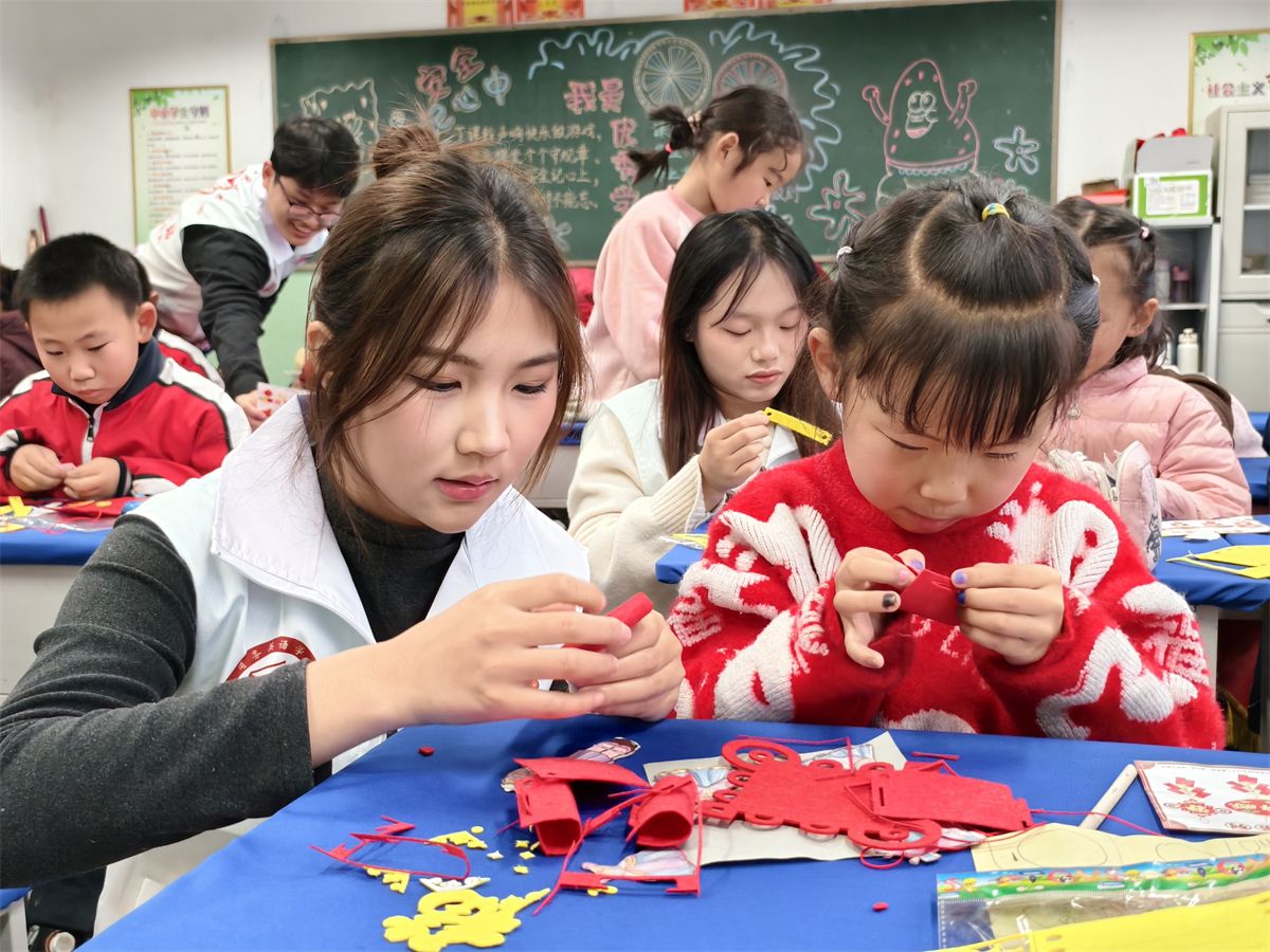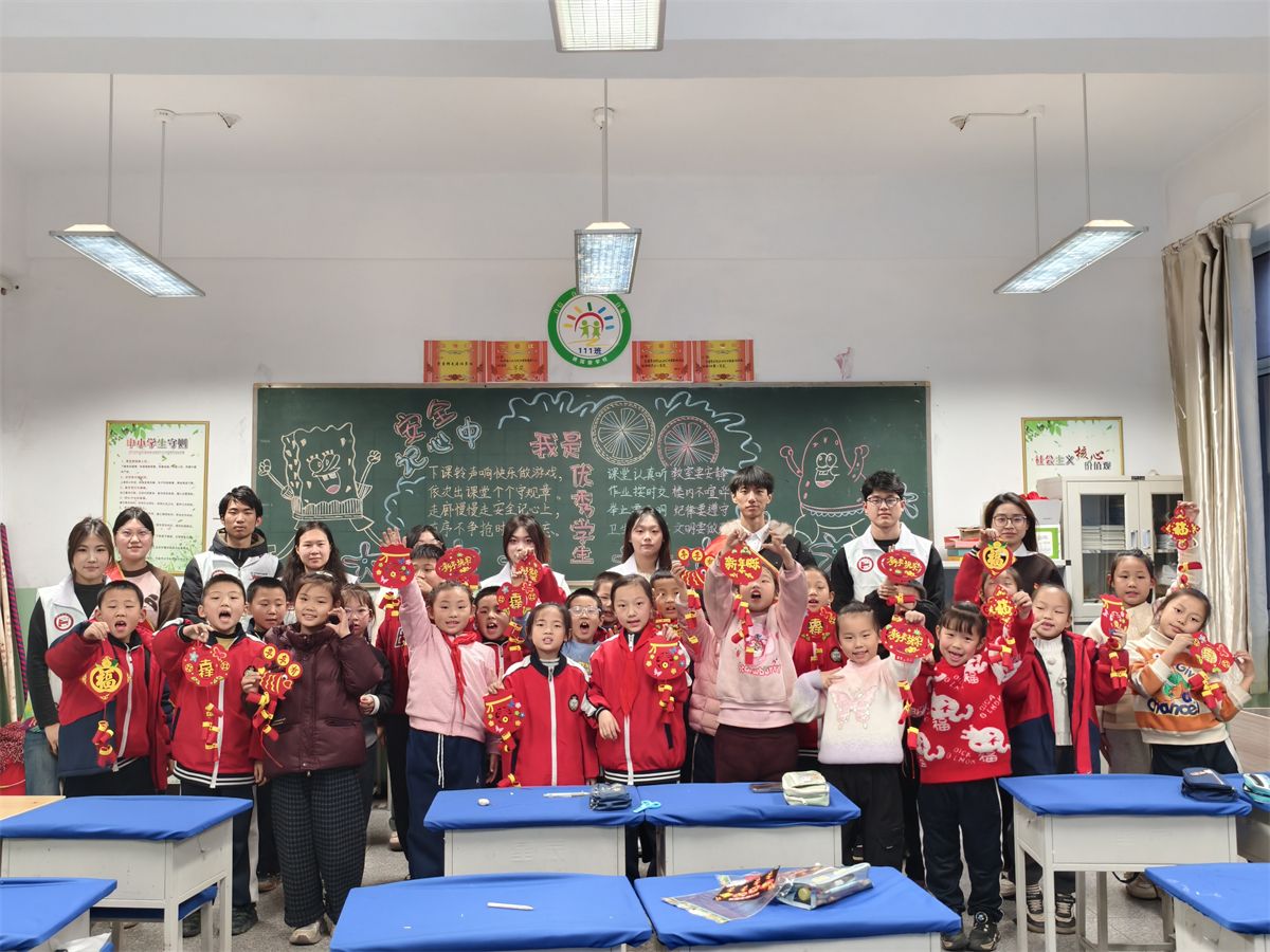 外语加油站专项志愿服务队以“英语+民俗”的创新模式,为孩子们打造沉浸式新年主题志愿课堂,通过将新年英语词汇与民俗内涵结合,借助趣味动画,让孩子们在认读中理解 fireworks、red envelope 等词汇背后的文化意义;通过讲解中外迎新习俗,带领孩子们领略多元文化风情;在手工环节,孩子们亲手制作不织布鞭炮,将新年憧憬凝于指尖。活动打破语言学习与文化传承的壁垒,让孩子们在趣味体验中提升英语能力,厚植家国情怀与国际视野。