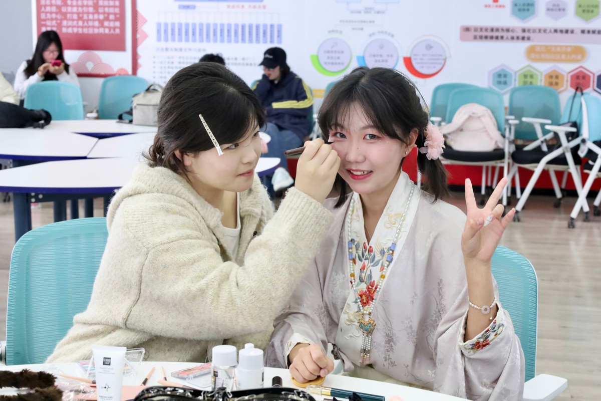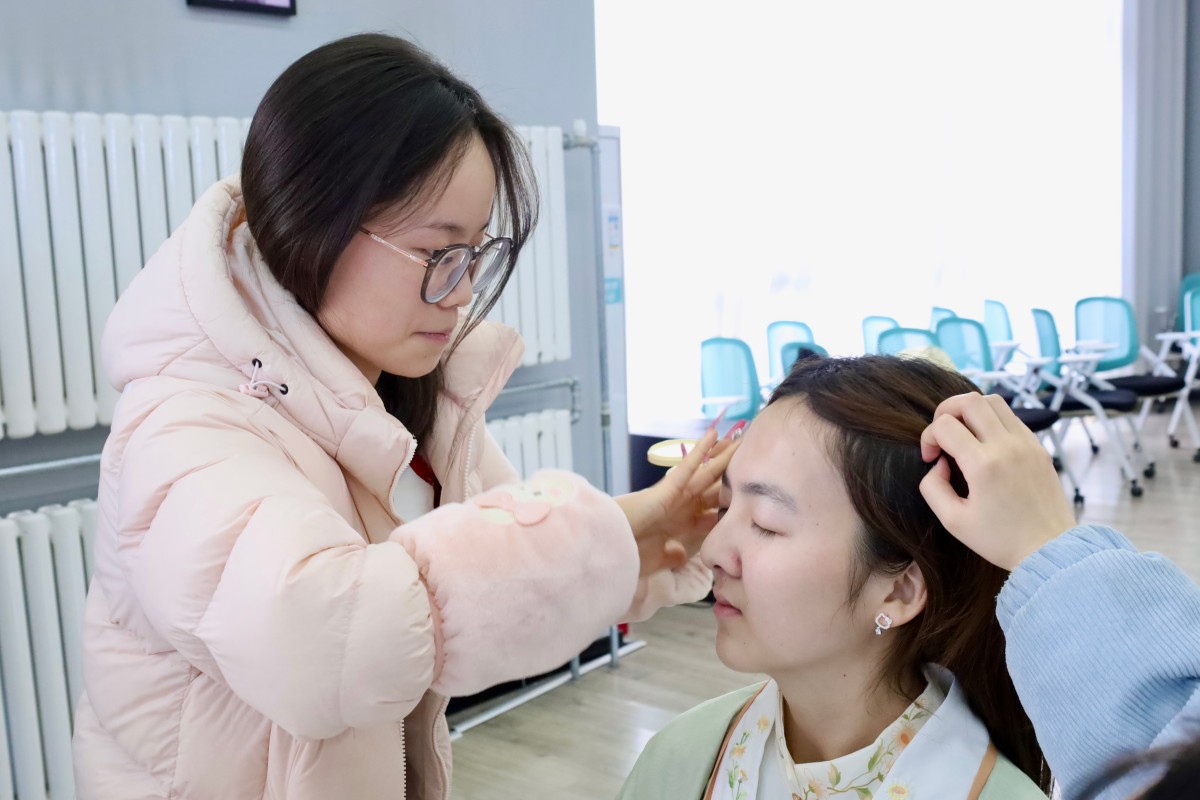 活动现场,化妆老师以古典妆容为切入点,执笔轻描细绘,远山眉清雅婉转,点绛唇灵动温婉,花钿贴额更添古韵,一颦一笑间,尽显古代仕女的温婉雅致。同学们围坐对镜,亲手勾勒眉眼,镜中倩影与千年佳人隔空呼应,在一笔一画中感受传统美学的魅力。