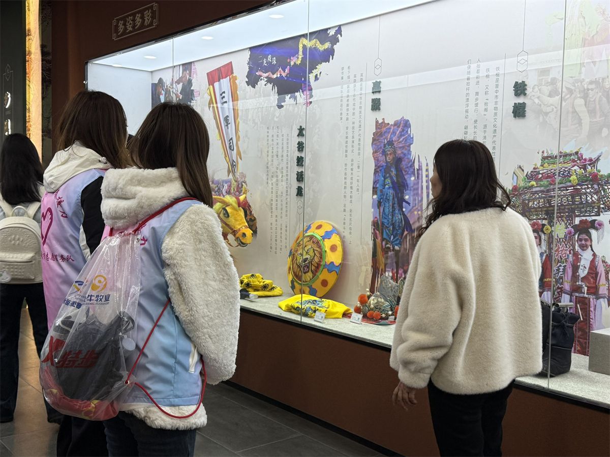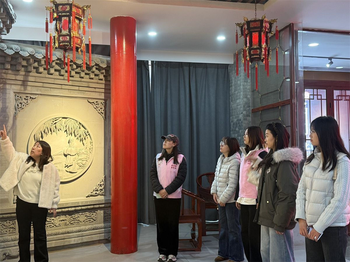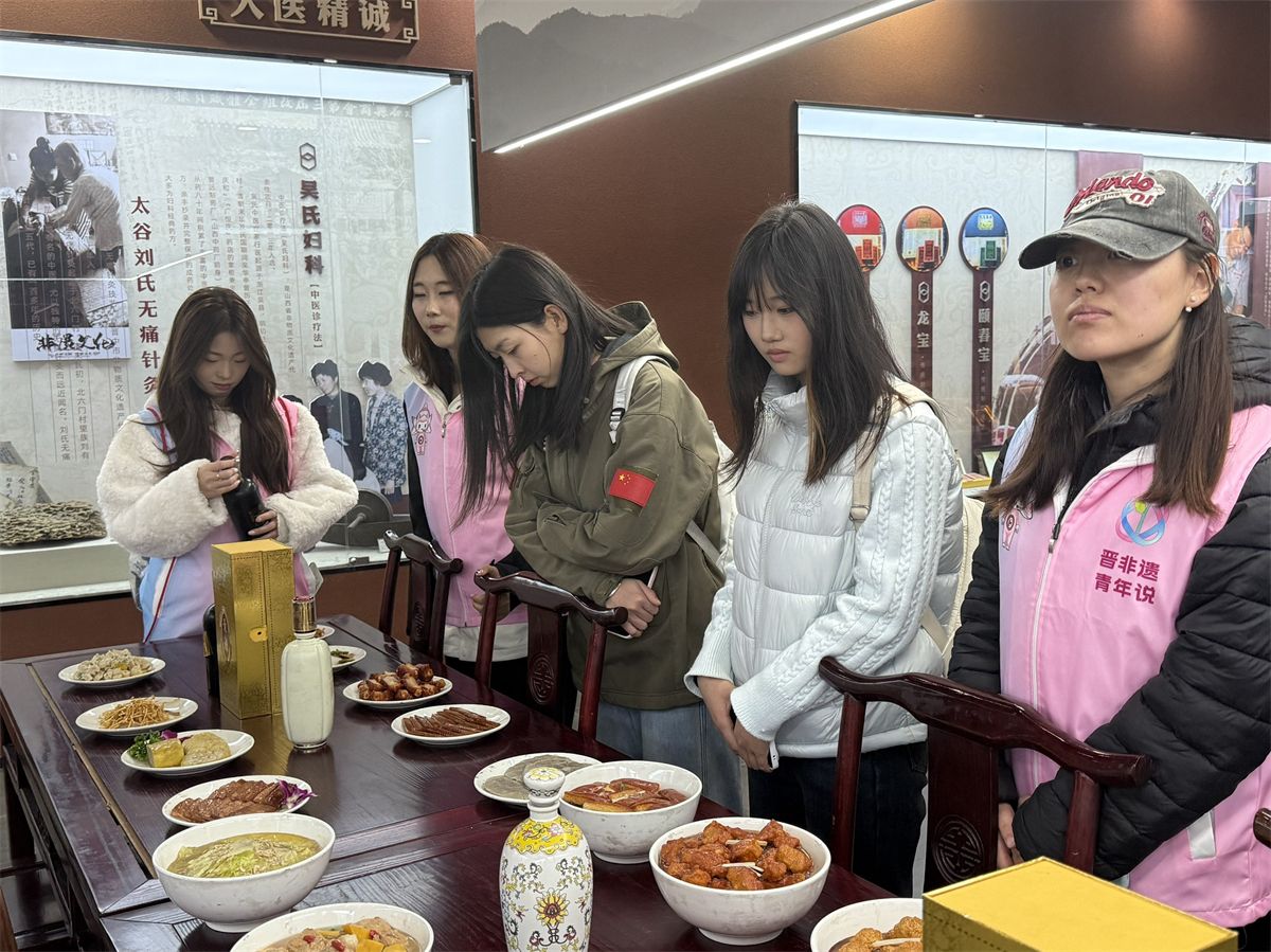 行程终章,志愿者们步入古朴庄重的太谷非遗馆,开启一场穿越时空的文化溯源之旅。若说制饼是“动手”的亲历、车间参观是“动眼”的震撼,那么非遗馆之行则是真正意义上的“动心”——精妙绝伦的砖雕石刻诉说着“石上生花”的千年绝技,古代名医的浮雕勾勒出太谷作为“北方药都”的昔日荣光。