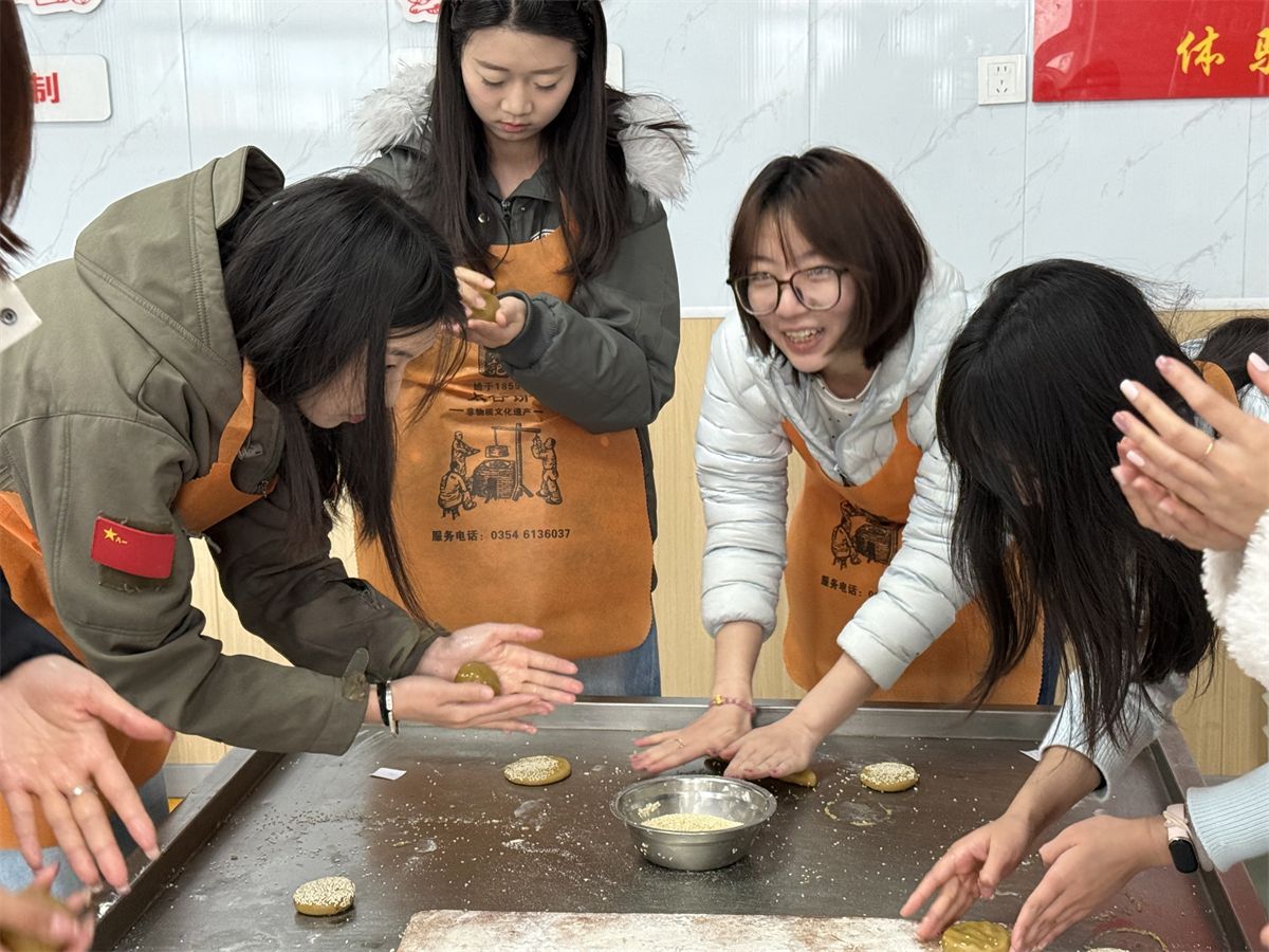 志愿者们步入太谷饼非遗工坊,在传承人指导下,同学们净手入座,躬身践行这项传承逾百年的老手艺。“三揉三醒看分寸,芝麻撒匀要轻震”,志愿者将醒透的面团置于掌心,轻轻搓圆,徐徐按压,指腹间感受着面团由软糯渐趋筋道的微妙变化。最考验心性的当属“蘸芝麻”——先浸清水、再滚芝麻、终轻震浮粒,传承人那一气呵成的娴熟动作,蕴含着数十年如一日的专注与沉淀,同学们不由慨叹:“原来一枚小小的饼里,藏着‘三分手艺,七分耐心’的奥义。”